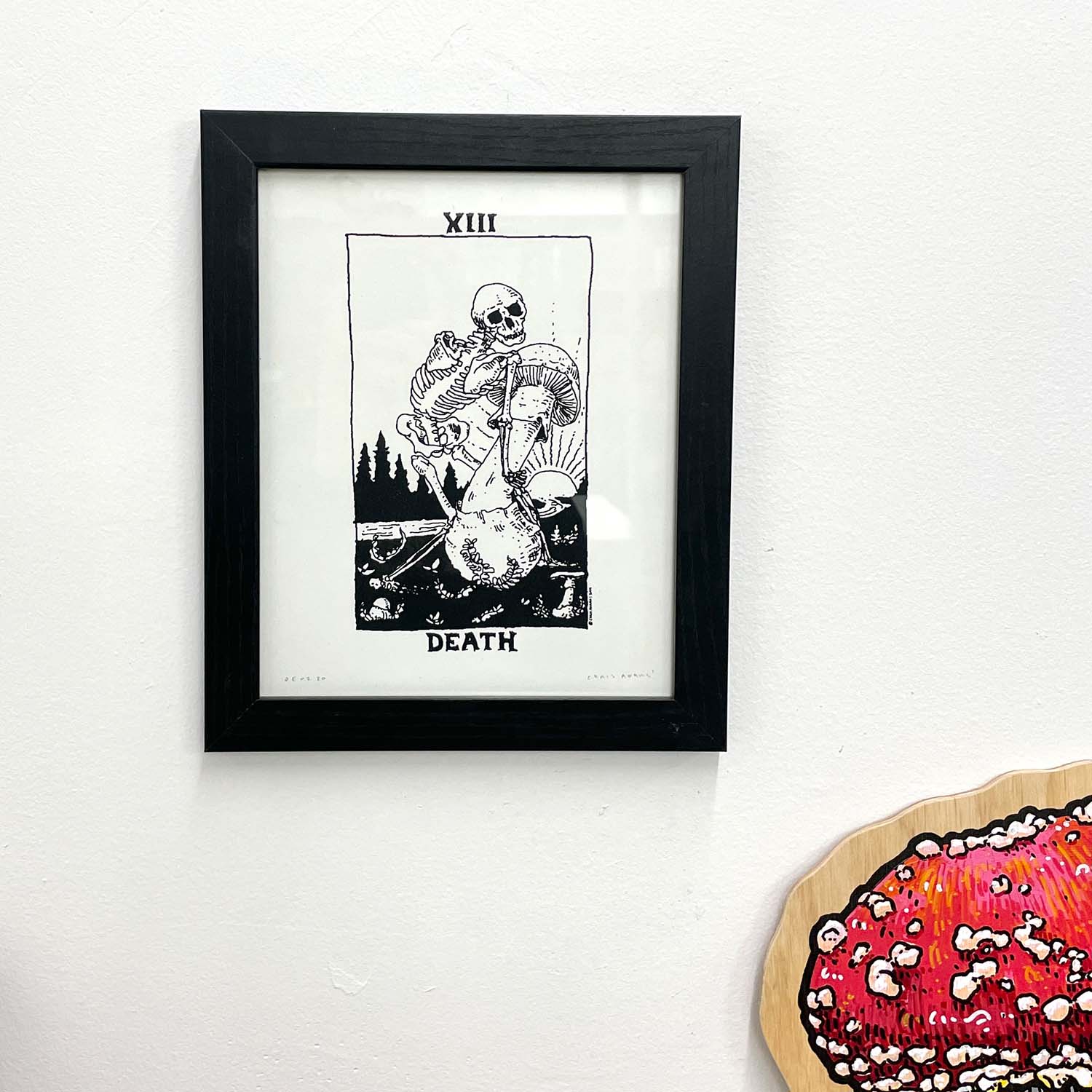 Hand Printed Silkscreen of the Death Card. Drawing features a skeleton waltzing with an Amanita ocreata in the friscalating dusk.