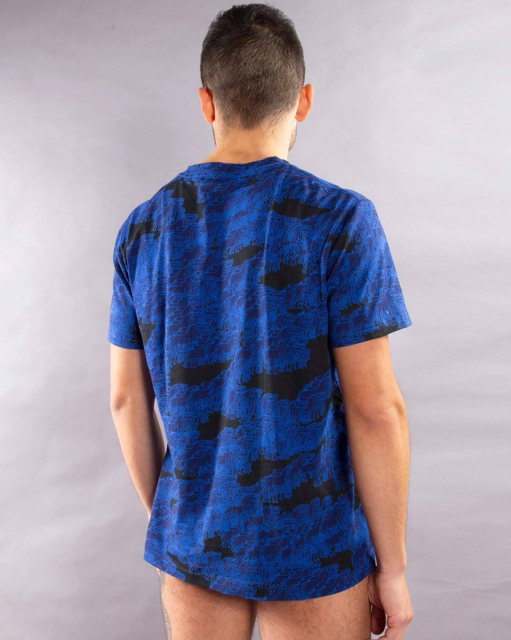 Mystical horse trails tee. Royal blue with navy and black all-over screen print, front, and sleeves. 100% Cotton.