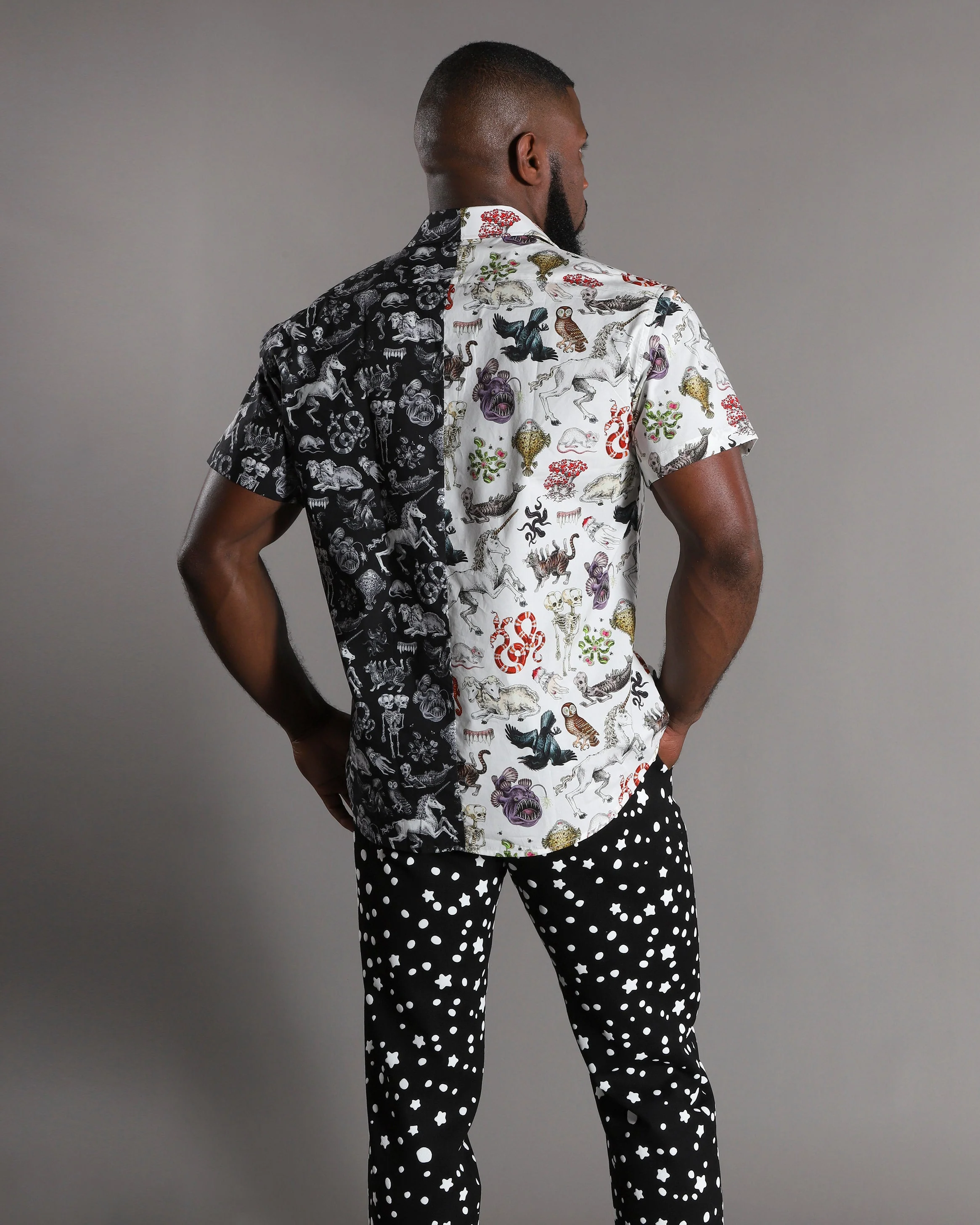 Can't decide?! Get the best of both underworlds in the hybrid Freak of Nature button up short sleeve shirt! 100% Cotton poplin with a modern fit we spent years perfecting. These gorgeous oddities are illustrated by Julian Farmar-Bowers just for Pretty Snake!