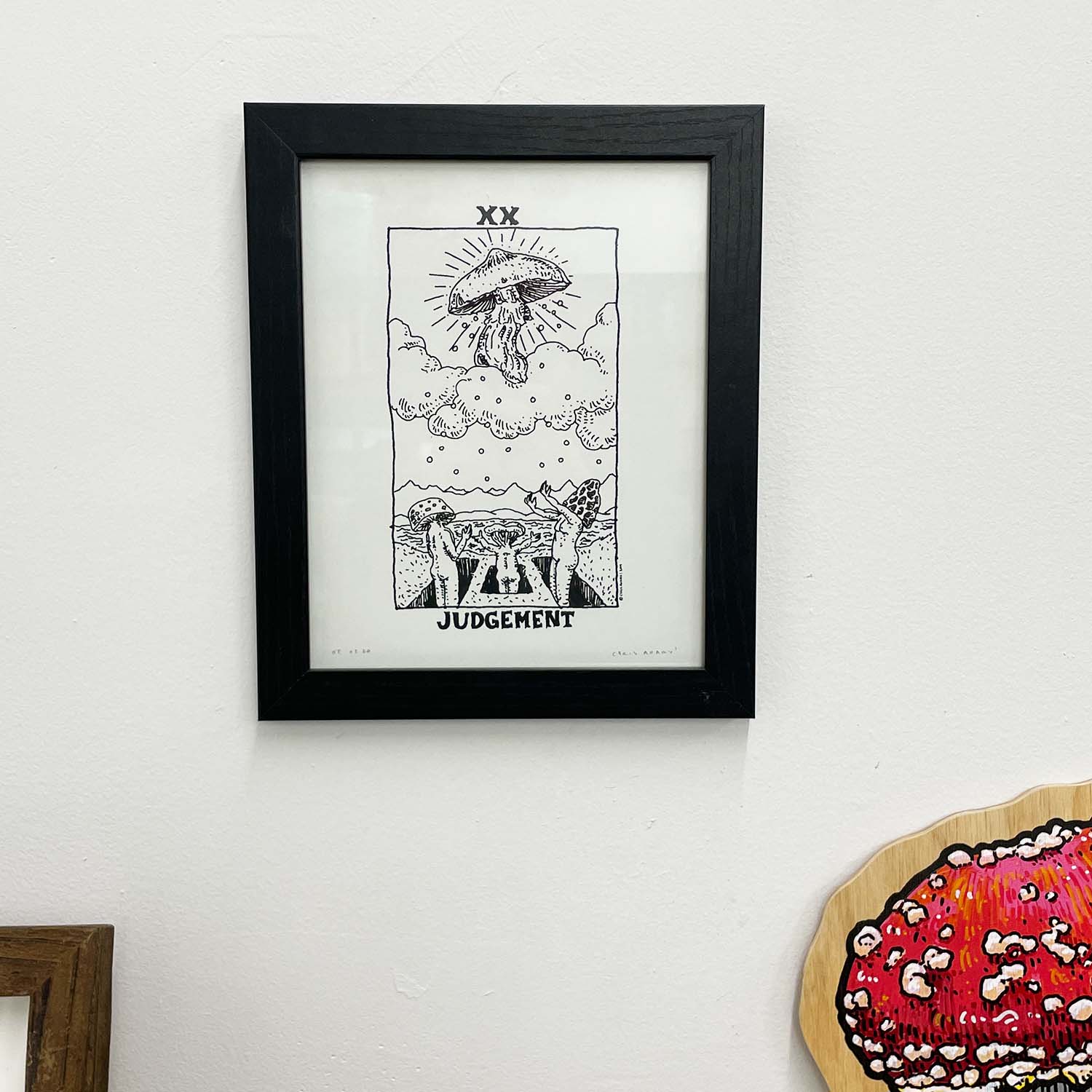 Hand Printed Silkscreen of the Judgement Card. This print features 3 Mushroom People reaching their hands towards the heavens. They seek clarity & assurance from The Great Teacher atop a cloud, who all-the-while showers spores of wisdom upon the earth below.