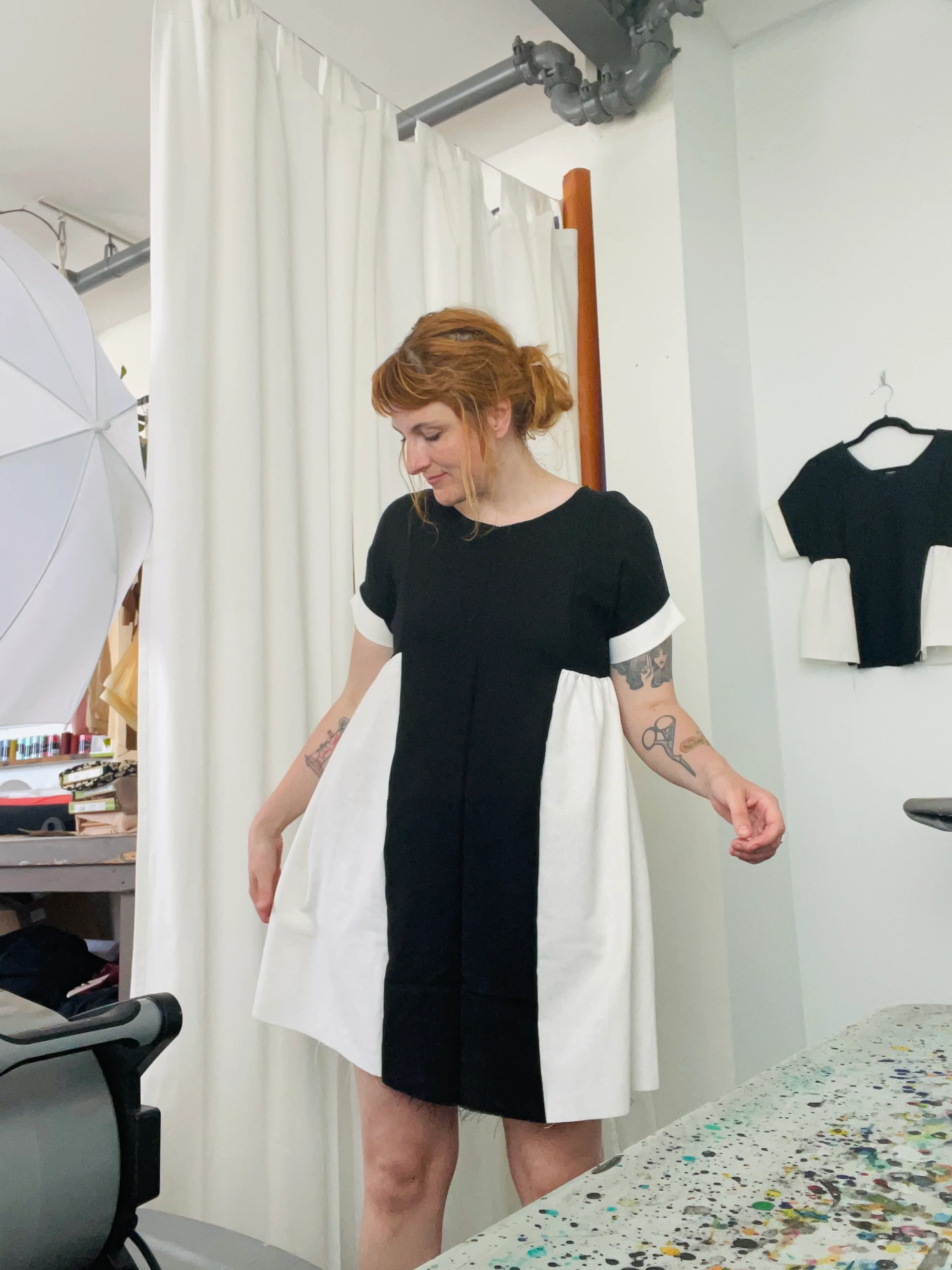 This dress was designed to utilize our remnant fabric stock in an effort to be more sustainable and apply zero-waste techniques at every possible turn. This woven shift dress has adorable gathers at the sides only which creates a truly lovely shape.
