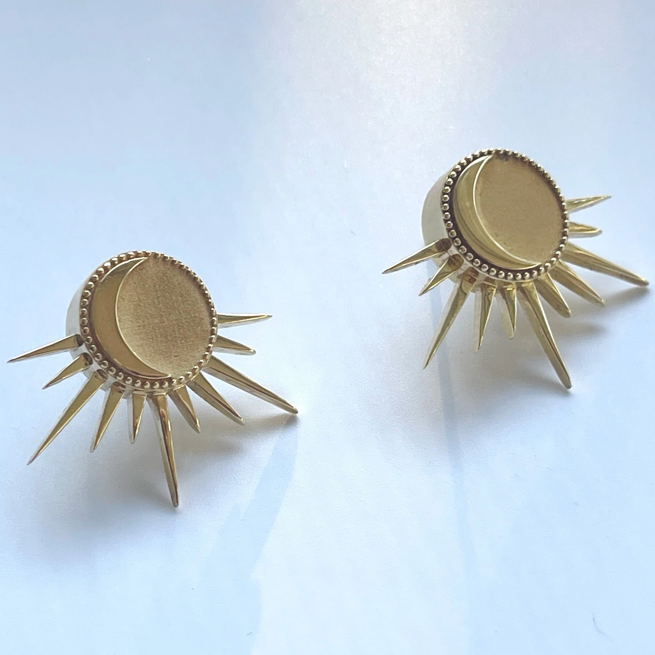 The Lunar Ray Earring studs within the Selene Collection draw inspiration from the radiant sun's rays and the graceful waning crescent moon with it's profound energy of gratitude. These earrings are a reflection of the sun's illuminating light and the moon's guiding influence.