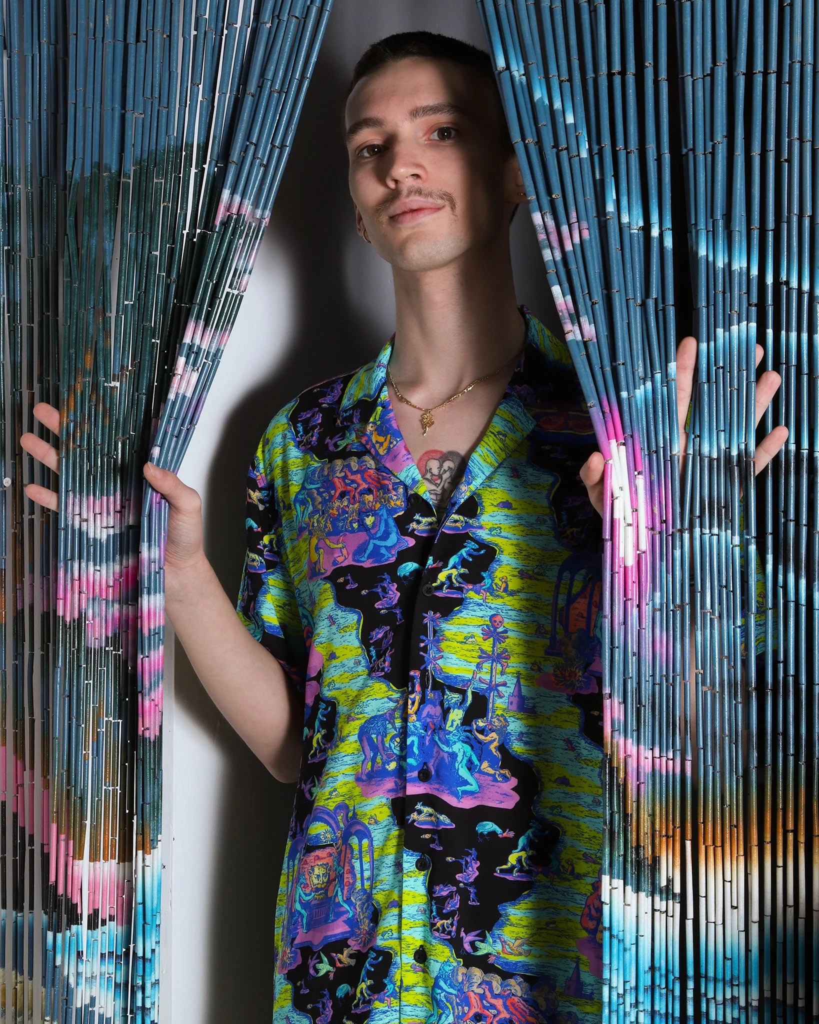 Explore an alternate reality in our summertime Ritual Shirt. This Night colorway is 100% rayon and has beautiful breezy fit. The shirt features a camp collar and our custom metal buttons.
