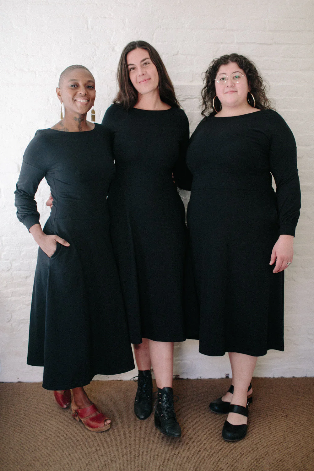 Binded boat neck and 3/4 arm cuffs with a little sheering to add some prairie goodness. Drop waist that can be hiked up if wanted. Big side-seam pockets. Tea length with a skirt that loves to twirl. Â