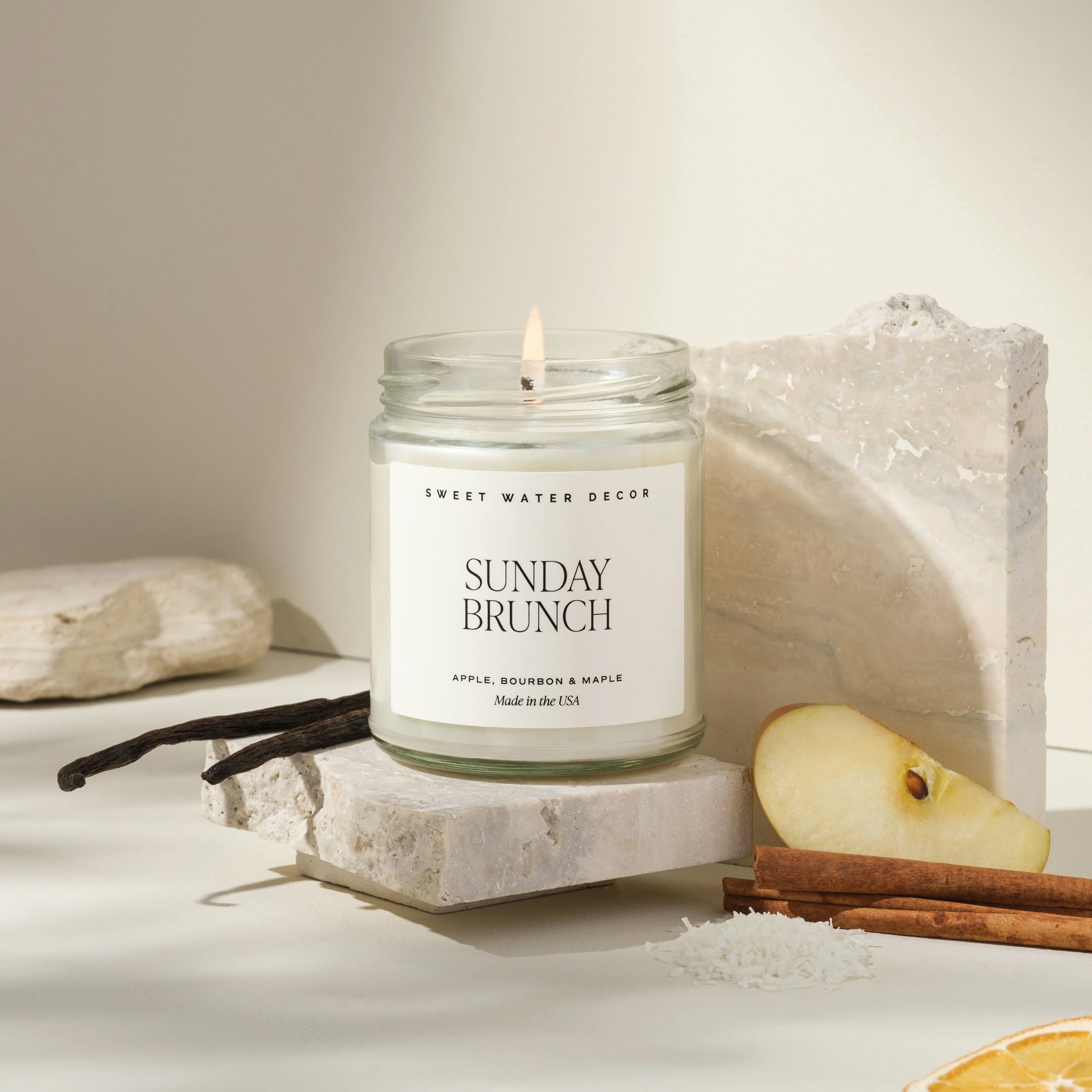 Our Sunday Brunch candle features our signature Farmhouse Kitchen scent. It's a sweet apple maple fragrance that will remind you of a hot apple toddy. Sweet maple is rounded out with tart apple notes, bourbon and vanilla.