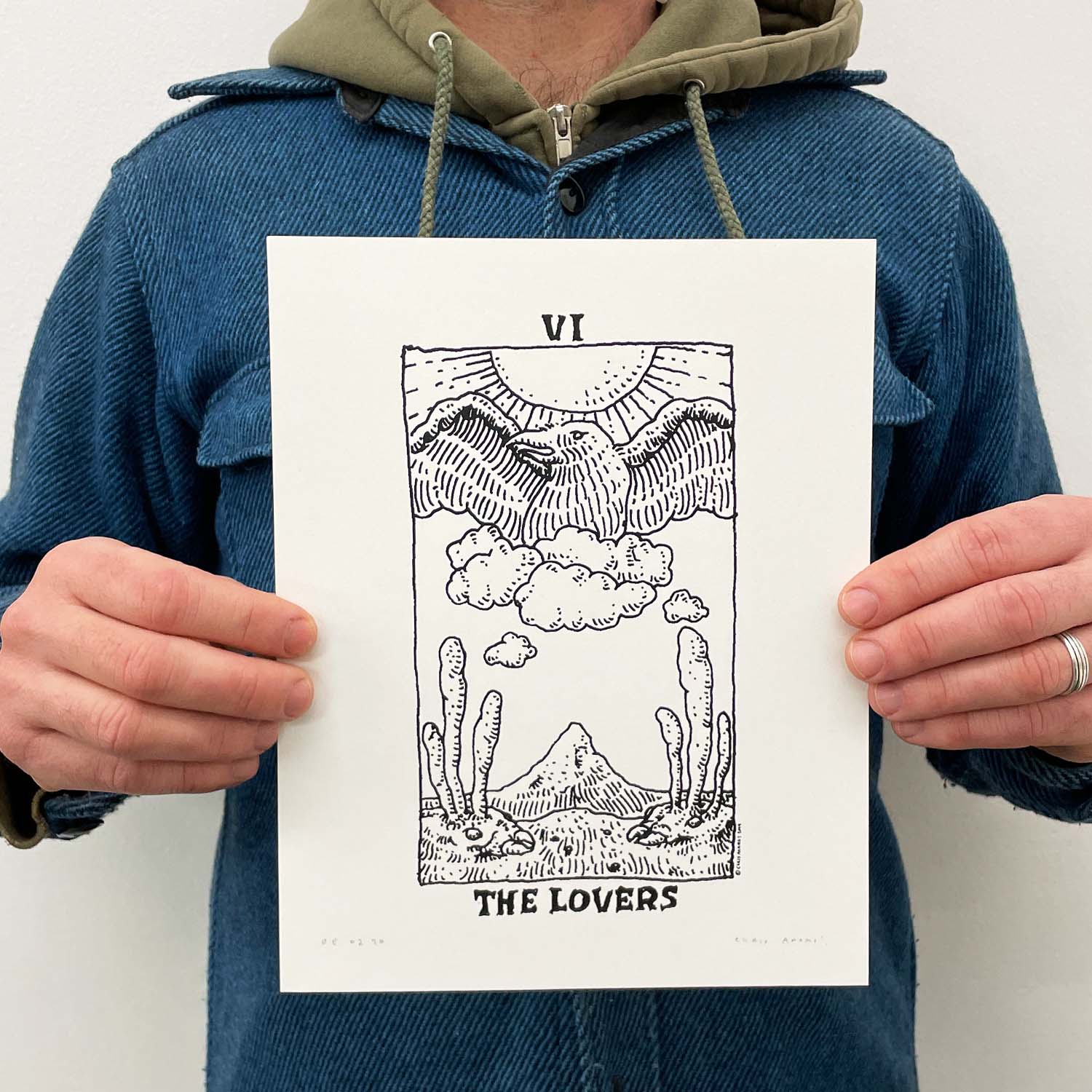 Hand Printed Silkscreen of The Lovers Card. This print features The Raven balancing light and dark from the sky above while Cordyceps Mushrooms engage in the ultimate act of love. Fusing their future with that of their host, they inhabit insects, control their minds, and finally burst forth to send their spores into the wind––starting the process once again.