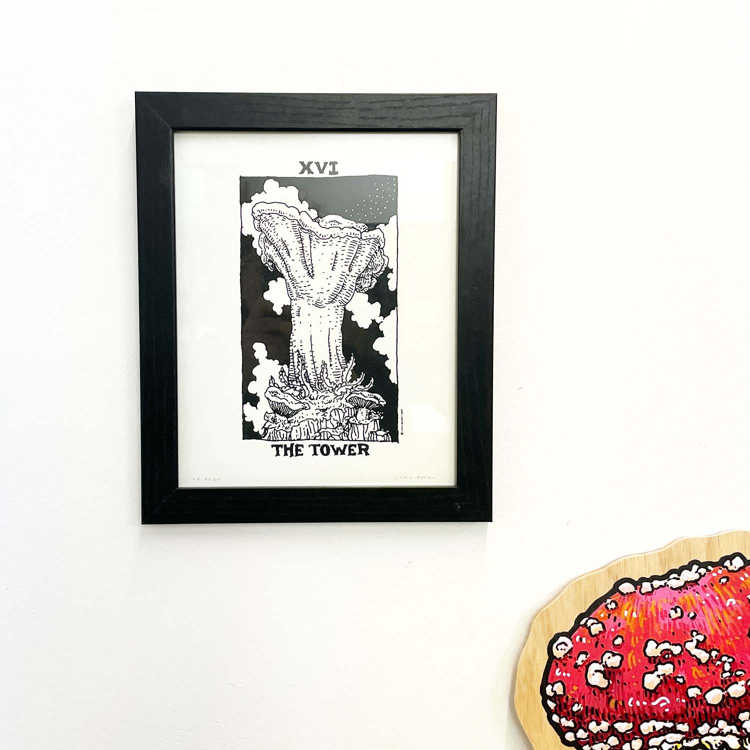 Hand Printed Silkscreen of The Tower Card. This print features a wicked stout Lobster Mushroom as well as two specimen of the Russula recipes they often begin as. The glorious, fishy smelling, neon orange mushrooms we know & love begin as unsuspecting Russula species, becoming inhabited by a secondary fungus, Hypomyces lactiflourum, they slowly change into a fully new entity. Birth, Life, Death and Rebirth ad infinitum.