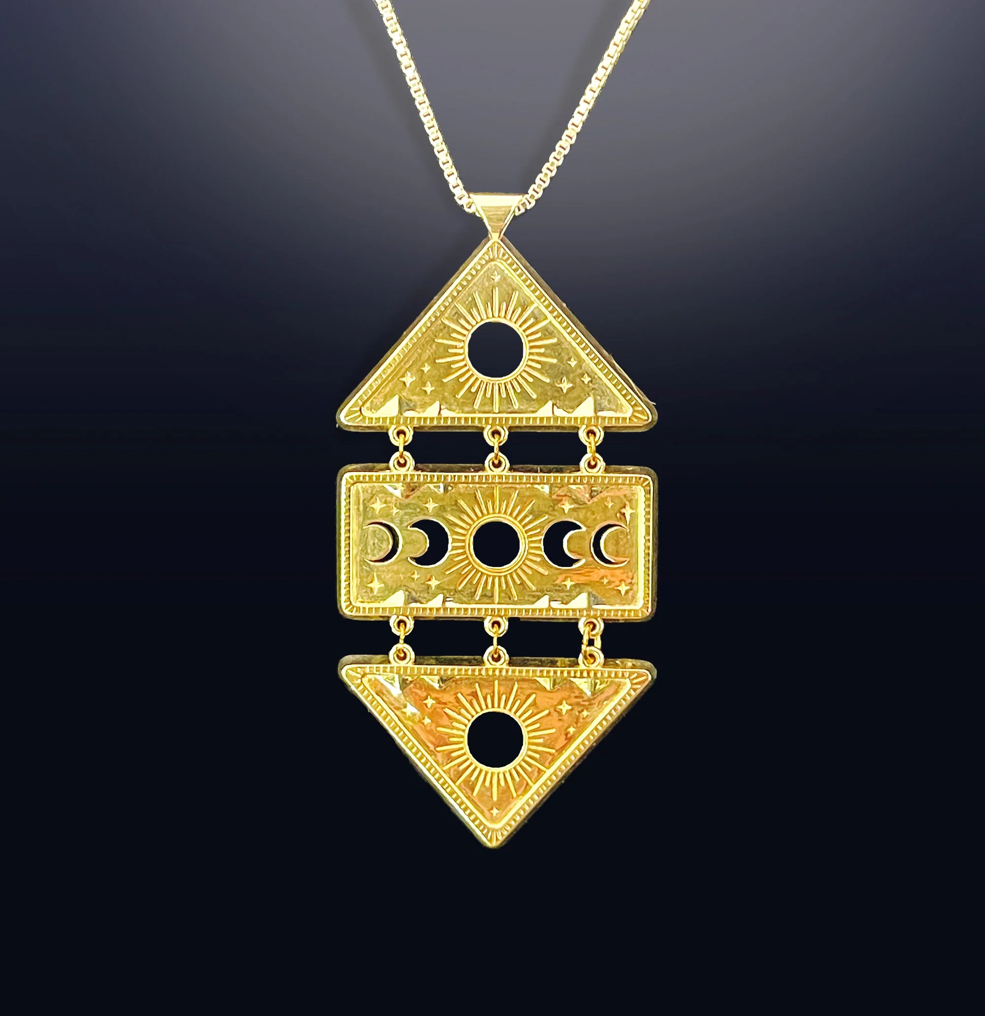 Incorporating elements from the sun and the rich history of ancient Egypt, the Trinitas Moon Phase Pendant Necklace within the Selene Collection weaves together three intricate parts, combining the mystique of the pyramids with the enchanting sun. Each pendant is crafted with meticulous attention to detail, resulting in a breathtaking union of contemporary craftsmanship and enduring grace.